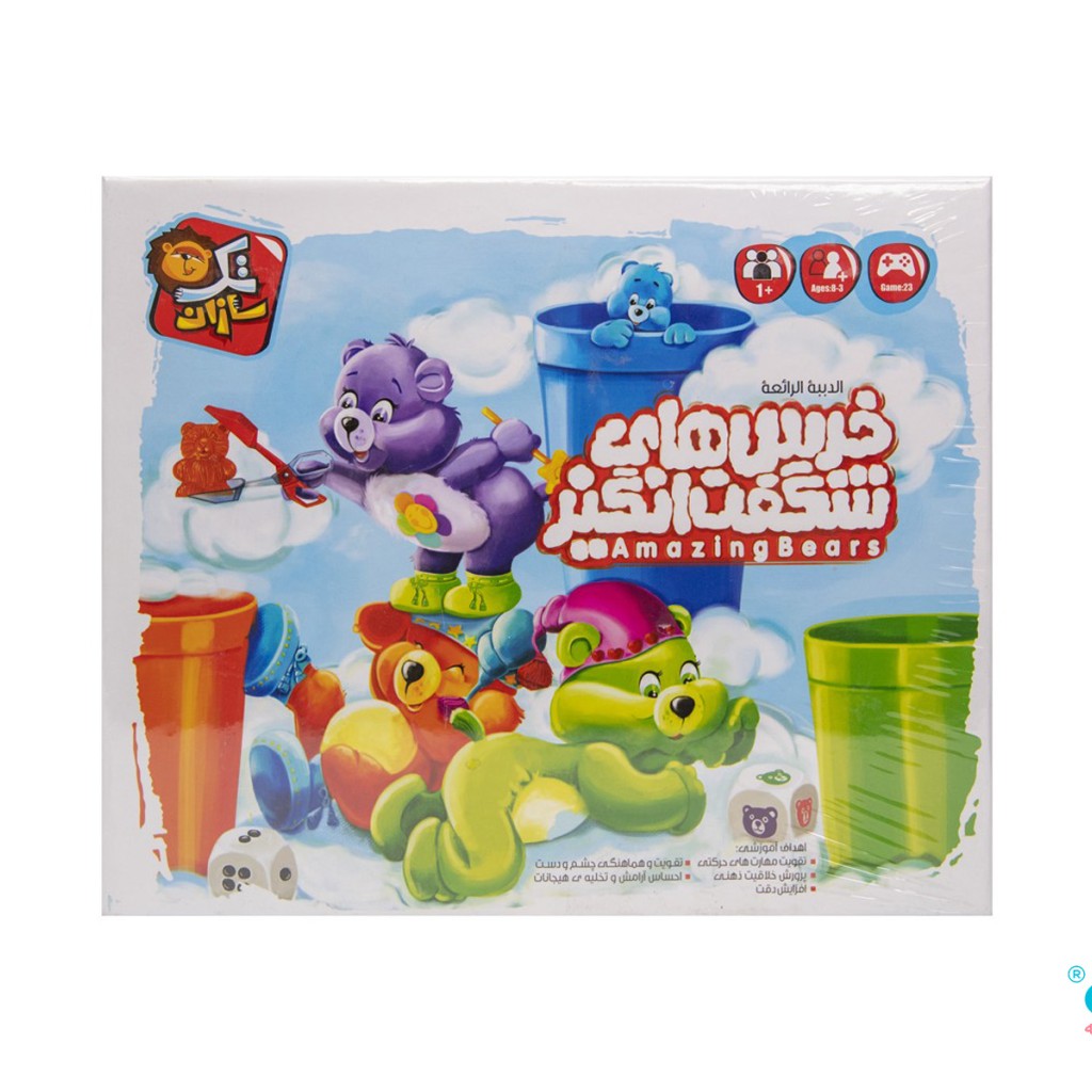 ۶۰ عدد خرس عروسکی در ۶ رنگ - ۶ عدد لیوان رنگی - ۲ عدد تاس - ۱۲ عدد کارت بازی - دفترچه راهنمای بازی
